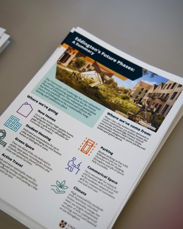 Extensive work has taken place this year to update the masterplan for the future phases of North West Cambridge, with opportunities for the local community to engage and help shape the design of the neighbourhood. Over three rounds of formal consultation, community engagement events and the Eddington Edition newsletter we explored topics important to the community, including the urban design of new homes, active transport routes, green and open space, sustainability (including nature and water), and play and activity spaces.